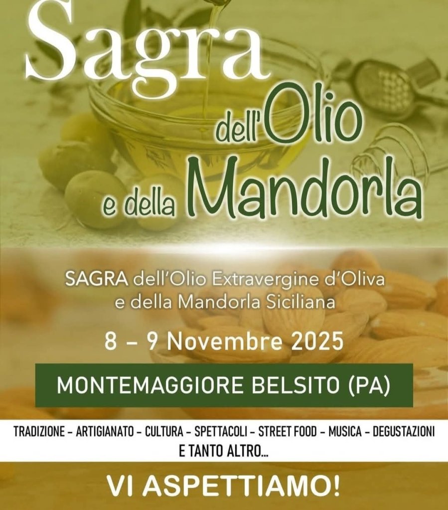Torna a Montemaggiore Belsito la Sagra dell’Olio extravergine d’oliva e della Mandorla siciliana: l’8 e il 9 novembre 2025 la quarta edizione di un evento che celebra la tradizione, l’artigianato e la cultura della terra siciliana. In particolare la terra di Montemaggiore è conosciuta per la sua fertilità e il suo clima soleggiato, che rende possibile la produzione di pregiati prodotti agricoli, tra cui la celebre mandorla pizzuta, oltre all’olio d’oliva di altissima qualità.
