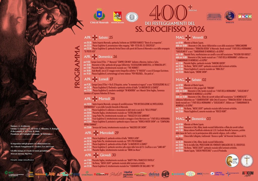 Fede, tradizione e identità si intrecciano a Monreale: la cittadina normanna si appresta a celebrare la 400ª edizione della Festa del Santissimo Crocifisso, uno degli eventi religiosi e popolari più significativi della Sicilia, che affonda le sue radici nel XVII secolo, quando – secondo la tradizione – il simulacro del Cristo crocifisso venne invocato dalla popolazione monrealese in un momento di grave calamità.