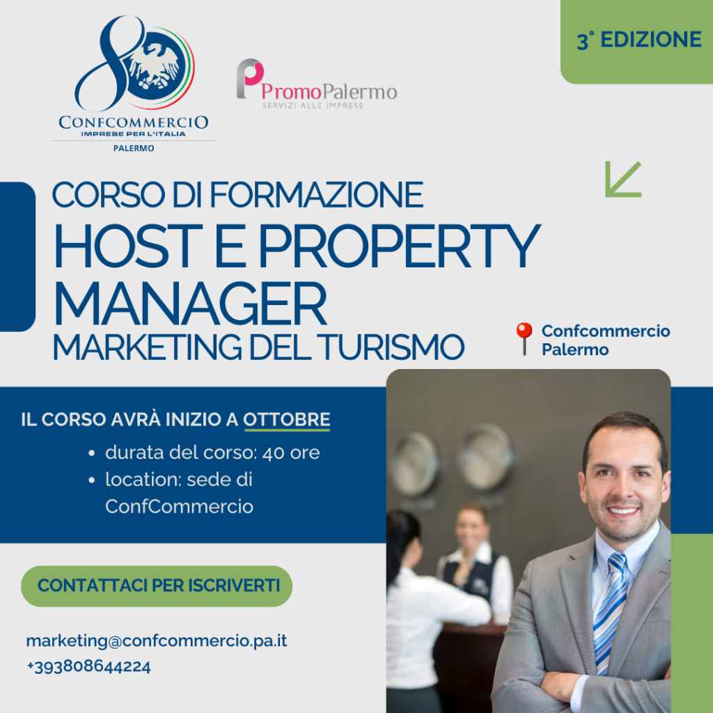 Parte il countdown per la 3^ edizione del corso di formazione ‘Host e Property Manager – Marketing del Turismo’. Il corso avrà luogo a Palermo, presso la Camera di Commercio dal 21 ottobre al 14 novembre 2025. Di seguito il calendario completo delle otto lezioni he saranno tenute, tra gli altri, dagli esperti Saverio Panzica, Antonio Marino, Giuseppe Noto, Sandro Stracuzzi.