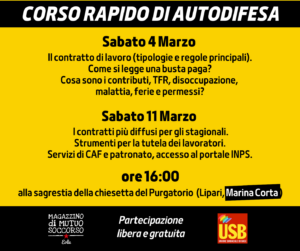 Negli incontri, in programma sabato 4 e sabato 11 marzo ospitati nella sagrestia della chiesetta del Purgatorio di Lipari, si discuterà di contratti di lavoro, buste paga, diritti a ferie e contributi, previdenza. Un “kit di sopravvivenza” secondo gli organizzatori soprattutto per chi si affaccia per la prima volta al mondo del lavoro.