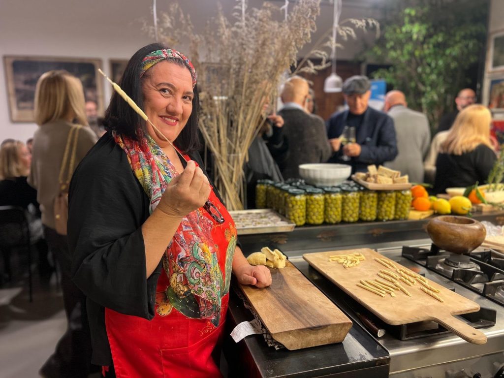 La busiata è definita come un tipo di pasta di semola a grano duro, tipica della Sicilia Occidentale caratterizzata da forma elicolidale a spirale. Il nome deriva da buso, fusto della pianta ampelodesmus mauritanicus usato anticamente per arrotolarla e oggi prodotta con mezzi meccanici. “Raccontiamo la storia di questa pasta – spiega Peppe Giuffrè – da come la preparavano le nostre nonne con le dise a come si condisce con un ottimo pesto alla trapanese preparato dal vivo”. Un piatto povera che, insieme al pesto trapanese, racconta la storia di un territorio e le sue produzioni tipiche. La serata è stata accompagnata da una selezione di vini del territorio e da un momento conviviale di networking con stampa e operatori.