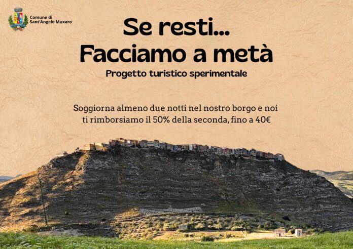 Il Comune di Sant’Angelo Muxaro rimborserà il 50% del costo della seconda notte a chi sceglie di fermarsi almeno due notti nelle locali strutture ricettive. Il nuovo progetto sperimentale promosso dall’Amministrazione Comunale, dal titolo “SE RESTI FACCIAMO A METÀ”, punta da un lato a sostenere le strutture ricettive del paese e dall’altro ad attrarre ancora più visitatori nel cuore della Sicilia.
