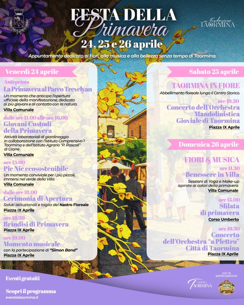 Per l’assessore al Turismo, Beatrice Briguglio, “questa manifestazione rappresenta un tassello importante nella strategia di promozione turistica della città. Puntiamo su eventi che valorizzino Taormina in tutte le stagioni, offrendo esperienze di qualità e rafforzando la sua attrattività anche oltre i grandi flussi estivi. La Festa della Primavera è un invito a vivere la città in modo autentico, tra natura, cultura e tradizione”.