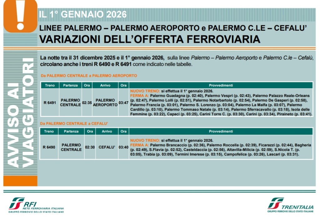 Rientro in sicurezza a Capodanno per chi festeggerà fino a tarda notte a Palermo. La Regione Siciliana, attraverso Regionale di Trenitalia, ha previsto due treni straordinari nella notte tra il 31 dicembre e il primo gennaio con partenza da Palermo Centrale alle 2.30 in direzione Cefalù (R 6490) e alle 2.35 in direzione Aeroporto Falcone-Borsellino (R 6491). Tutte le fermate intermedie lungo le rispettive tratte saranno garantite. Sarà possibile acquistare i biglietti tramite il personale Trenitalia presente in stazione.