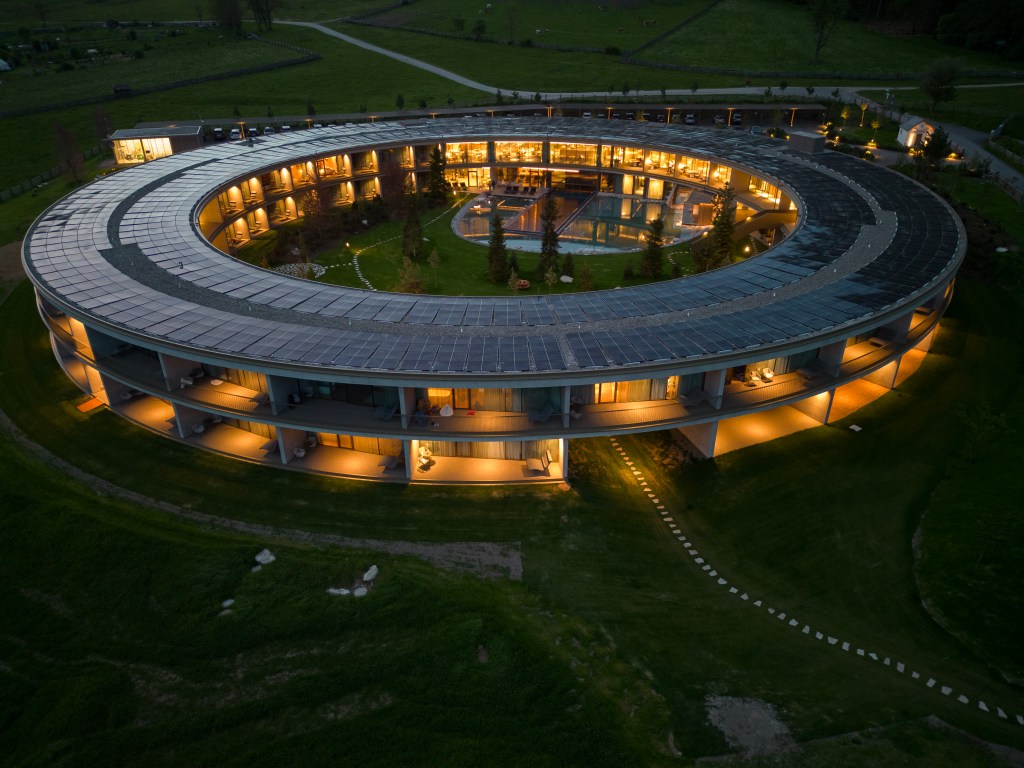 Ideato da Christian Lechner e Thomas Steiner e progettato dall’architetto Andreas Gruber, OLM è un manifesto architettonico. La forma circolare, oltre ad essere funzionale esteticamente per una totale immersione nel paesaggio, rappresenta il ciclo infinito della natura. La facciata in legno di larice locale, i mobili realizzati da artigiani del territorio e l’acqua potabile proveniente dal proprio pozzo artesiano completano un capolavoro della sostenibilità. Sul fronte energetico, i numeri parlano da soli: un campo geotermico di 15.000 m² con 126 sonde, un impianto fotovoltaico da 645 kWp e una classe energetica Klimahaus A a soli 14 kWh/m² annui.