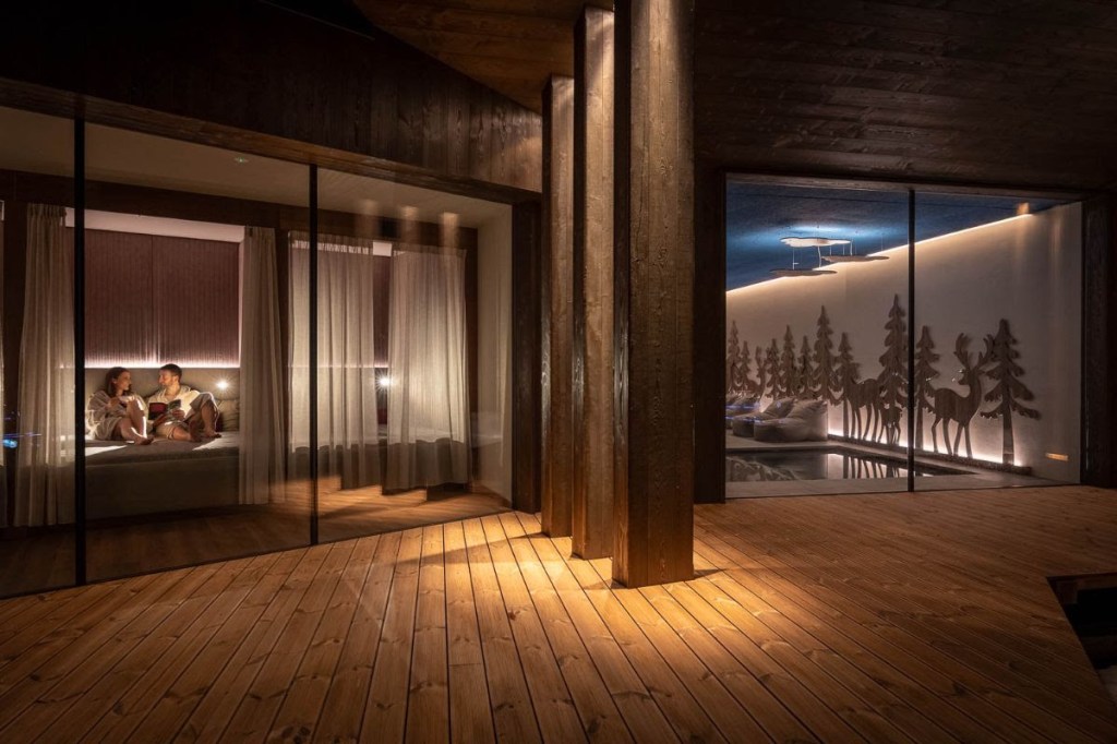 Inaugurata a dicembre 2024, la nuova ed elegante area wellness dell’Hotel Vioz offre ora 700 mq di grande raffinatezza con vista sulle montagne della Val di Sole, uno scenario unico che contribuisce a quel benessere totale di corpo, anima e mente tanto ricercato dagli ospiti, in particolare dopo una giornata trascorsa a esplorare i boschi. Cuore del progetto sono le due piscine interne riscaldate per i bambini, una profonda 30 cm per i più piccoli e l’altra profonda 70 cm e dotata di scivolo, e la bellissima piscina riscaldata, interna ed esterna, di 100 mq e adatta a tutta la famiglia, che permette di ammirare a 360 gradi il magnifico panorama. Non mancano le aree relax, compresa una stanza con favolosi materassi ad acqua, la tea-room, la Family Sauna panoramica con temperatura adatta anche ai bambini, la vasca fredda esterna per completare il percorso sauna e aumentare le difese immunitarie e la splendida terrazza solarium che sovrasta la struttura. Con l’apertura di questa nuova area wellness la spa Aphrodite è ora dedicata solo agli adulti, che possono concedersi trattamenti, bagni aromatizzati, sauna, bagno turco e infinito relax in un ambiente intimo. Non manca un idromassaggio riscaldato all’aperto.