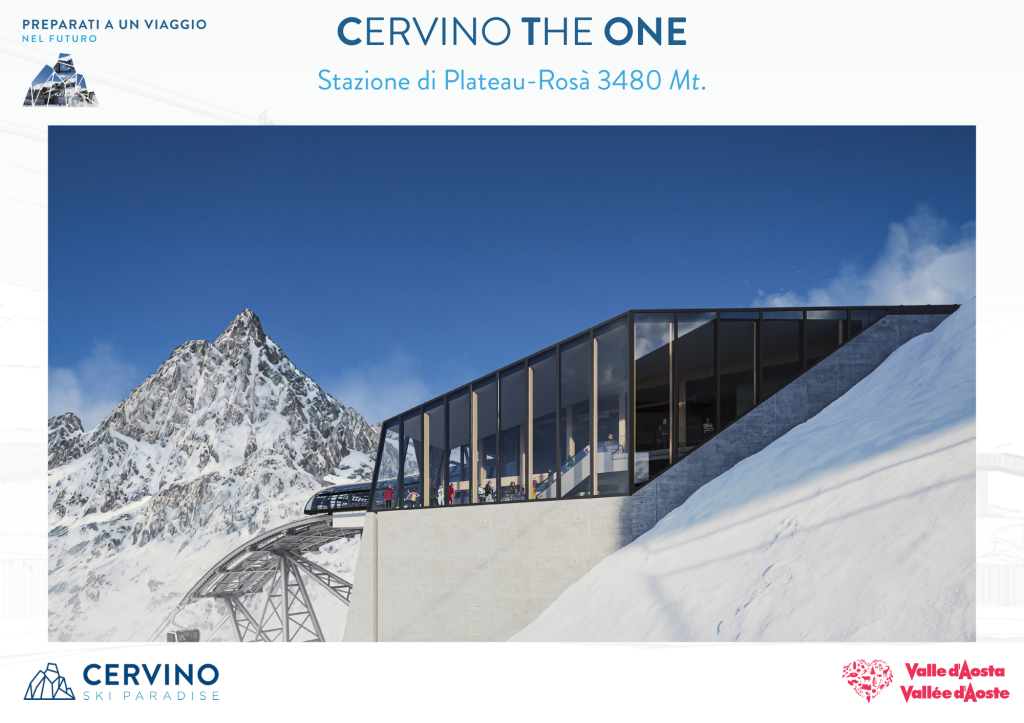 CERVINO THE ONE è il nome dell’impianto di fondamentale importanza strategica che in poco più di un quarto d’ora collegherà il centro di Breuil-Cervinia a Plateau Rosa, la zona di confine con la Svizzera dove parte Matterhorn Alpine Crossing che conduce al Piccolo Cervino. Una denominazione che pone al centro la montagna simbolo – conosciuta in tutto il mondo – e l’unicità dell’opera, in un binomio di parole semplici, universali e identificative.